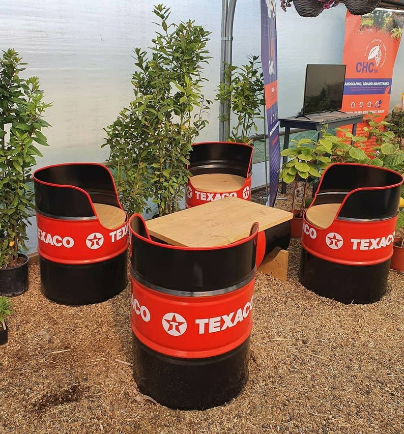 Upcycled Texaco oil drums converted into furniture consisting of: